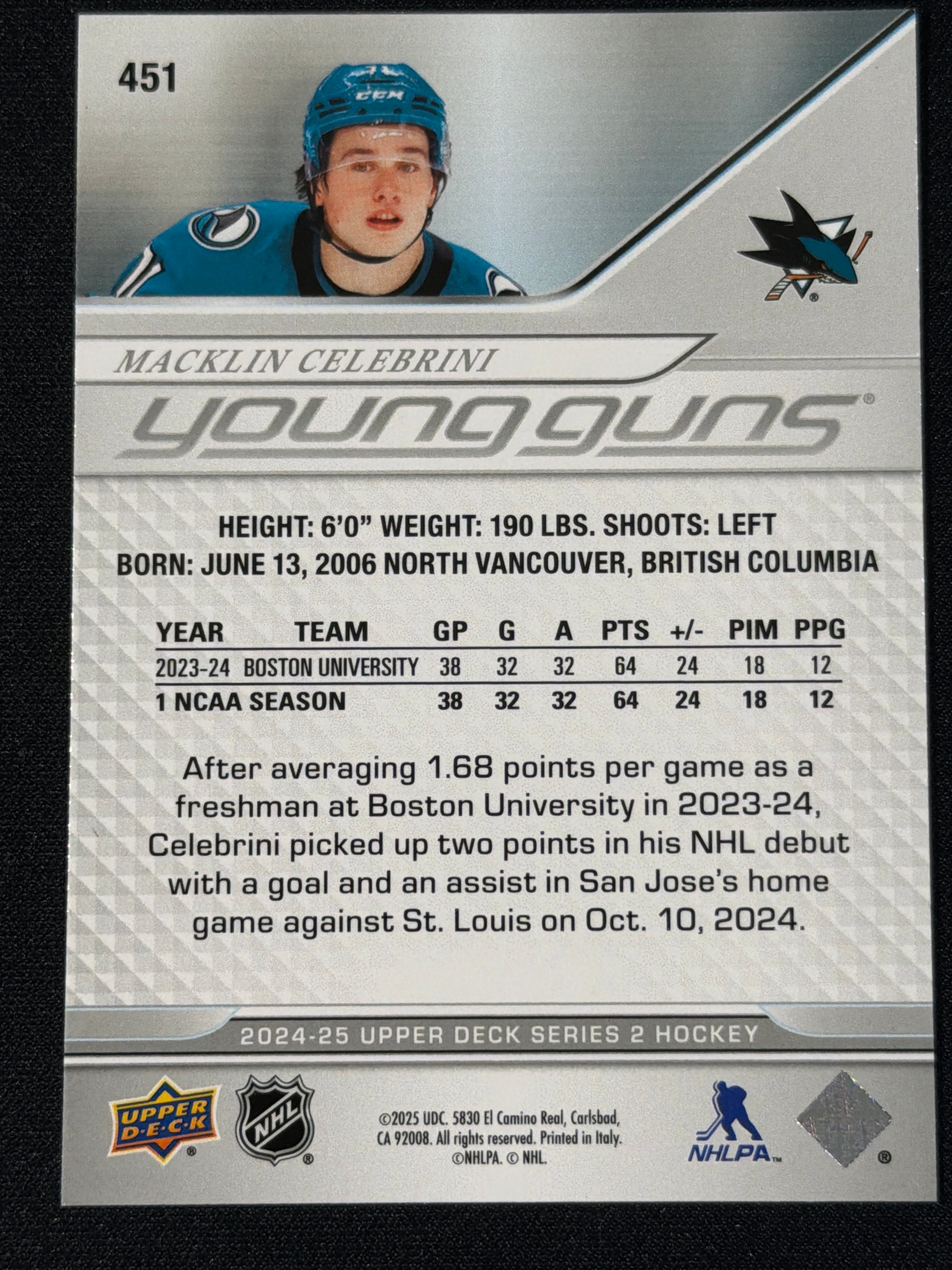 Macklin Celebrini #451 Rookie Card